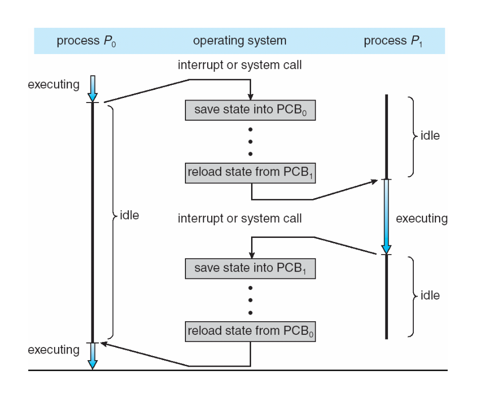 인터럽트(Interrupt)나 시스템 콜과 같은 특정 이벤트가 발생하면 실행 중인 프로세스의 context를 PCB에 저장하고, 이후 해당 프로세스가 I/O completion에 의해 레디큐로 갔다가 다시 CPU를 점유하면 저장했던 context를 다시 복원(restore)함