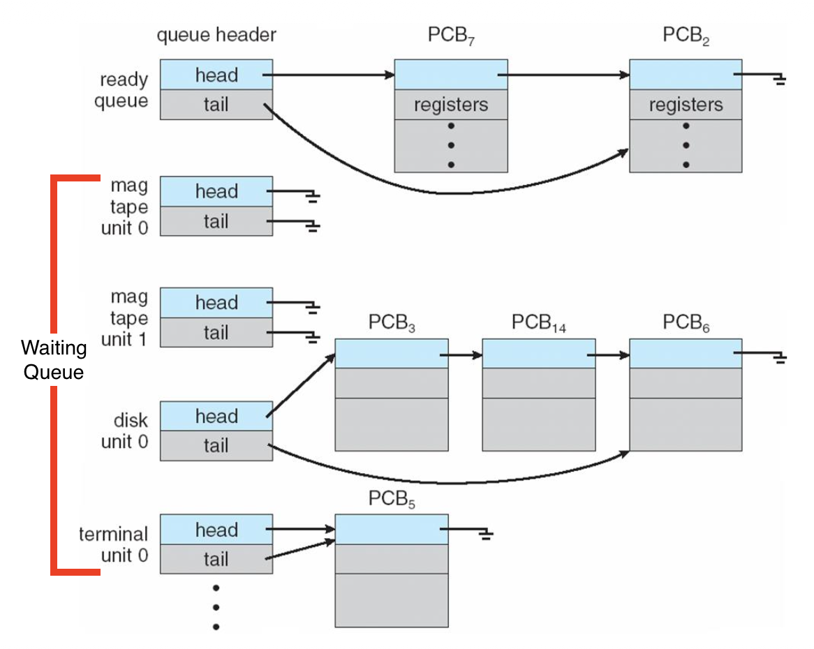프로세스 스케줄링을 위한 자료구조로, OS가 CPU와 I/O 자원을 효율적으로 분배하기 위해 프로세스들을 담아두는 큐들을 가리킴