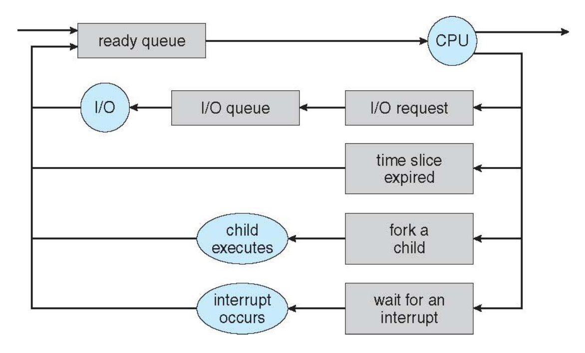 스케줄링 큐들의 관계와 프로세스의 이동 흐름을 나타내는 다이어그램