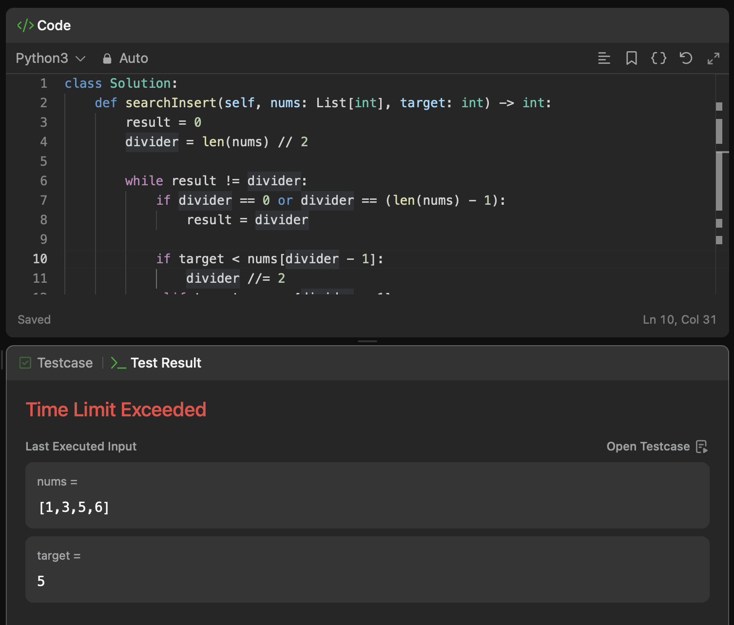 위 케이스를 기준으로 설명해보자면, left와 right 값이 동일해지는 순간 `right = mid - 1` 코드가 실행되고 right는 left보다 값이 작아져 더이상 반복문을 순회하지 않습니다. 그리고 이를 통해 알 수 있는 것은 "left == right == mid 인 경우, nums[mid] 값은 target보다 컸다"